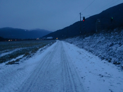 retour war es dann leider schon dunkel. geplant waren intervalle. 1km locker, 1km tempo etc. mit insgesamt 5x 1km tempo aber so richtig gut geht das nicht, wenn man auf schnee bzw. eis laufen muss und es wie gesagt dunkel ist. die stirnlampe hilft da auch nicht so viel. die ersten 2km waren noch o.k. - da waren auch die verhältnisse besser - die letzten 3 schon sehr grenzwertig. egal. puls war oben und sooo langsam war ich dann auch nicht.