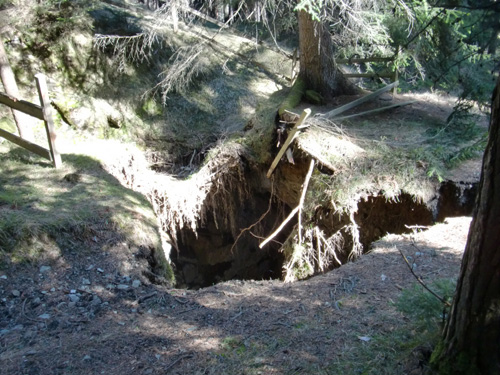 zum einen ein loch im weg. brutal, da ist zwar in der nähe ein alter stollen, aber dass der boden so einfach wegbricht. da geht's ganz schön runter.