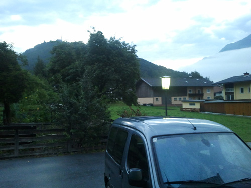 in der früh die tägliche überraschung wie das wetter ist. nicht sooo toll, wenn man um 6e aus dem fenster schaut und sieht, dass man 30min später nass sein wird. strasse nass und regenwolken.