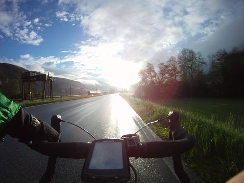 also heute rennradln. in der früh war das wetter um 06:30 mit 8° recht frisch, aber sonst sogar mit sonne. nur die strasse war noch ziemlich nass. so wie ich nach ein paar minuten.